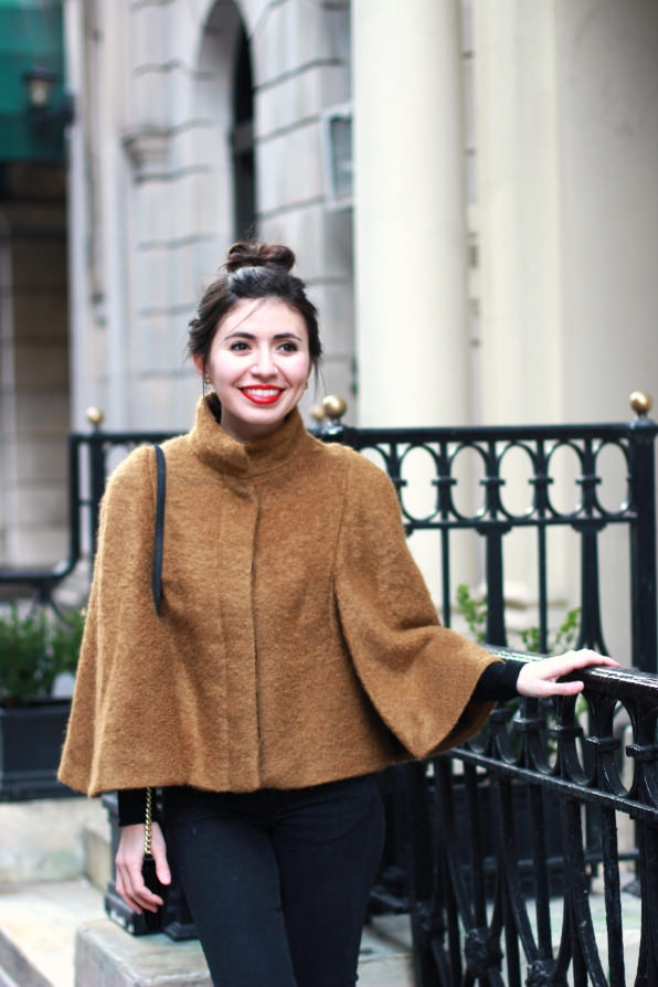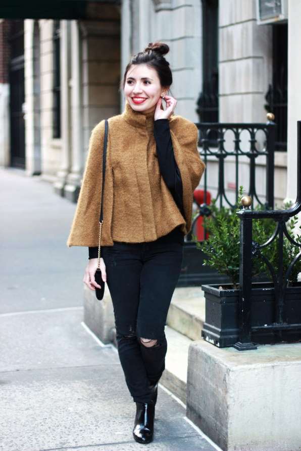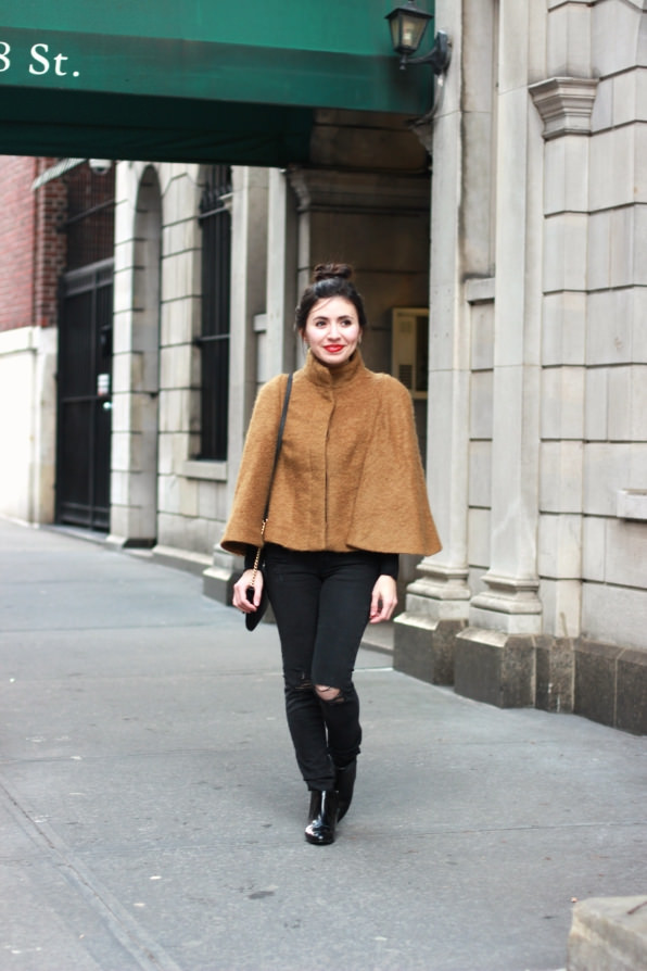 I picked this camel cape up from ZARA not long ago, and have been more than obsessed with it ever since. It’s such a chic and classic piece to throw on over a basic tee or casual long sleeve top. Not to mention, a fun second option to your usual go-to coat or cover up. With the weather being a bit chilly in NYC still, I’ve been finding new ways to bundle up while still attempting to look put together. Nothing says effortless chic quite like a classic cape. Throw in a top knot plus a red lip, and your good to go for a day of fun in the city!