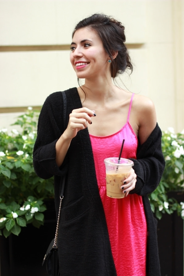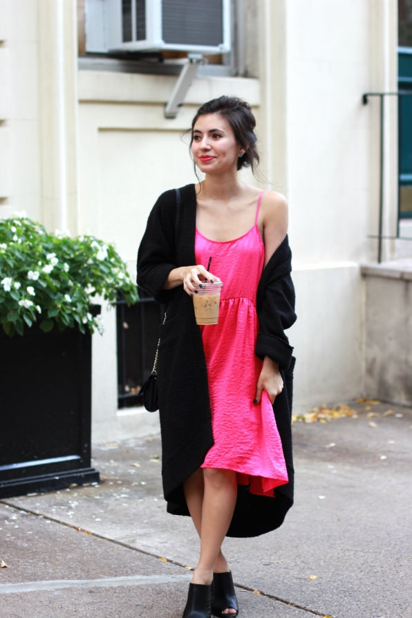 I wanted to share my version of a ‘Carrie Moment’, with the look above. I’ve been living in this pink strappy dress on the weekends. (Also comes in black and a gorgeous amber color!) I’m starting to layer it under cozy knits on chilly mornings, and am so tempted to buy it in the other colors as well. Throw on a cozy cardigan, some great shoes, and you’re all set! It’s never been so easy to pretend to be Carrie. xoxo