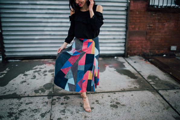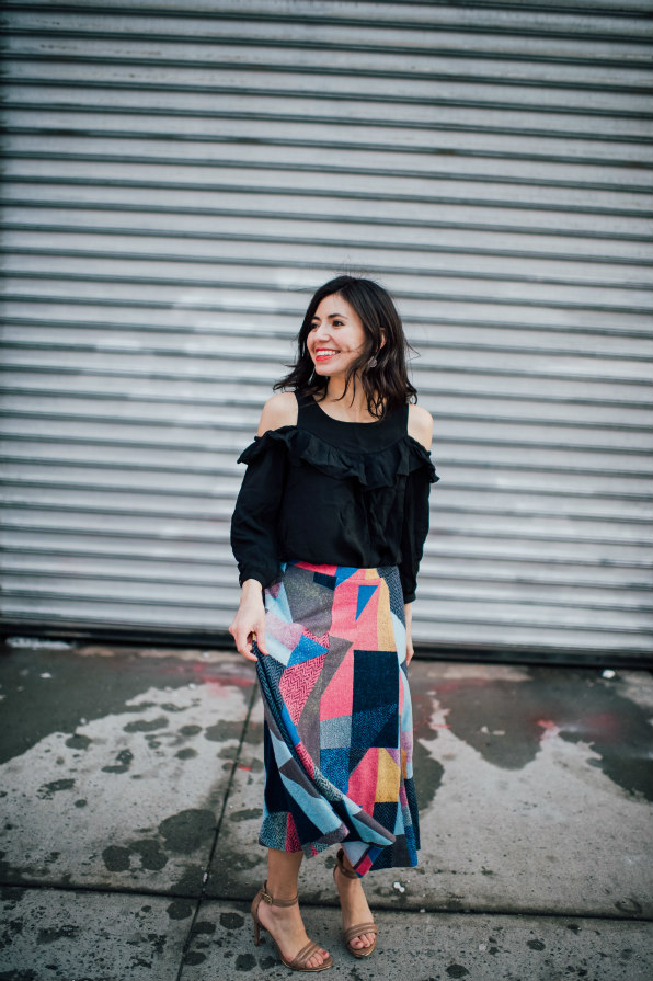 Anthropologie Mavra Open-Shoulder Blouse | Anthropologie Knit Midi Skirt |